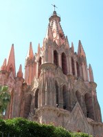 After thirty years of Quaker worship as well as my experience of Spirit in nature, I hadn’t expected to be so drawn to a Catholic church in Mexico. My husband and I have visited San Miguel de Allende in Guanajuato, Mexico several times and have worshipped there with Quakers in the home of an expatriate. At every visit, though, I’ve also been drawn to La Parroquia, the parish church in the main square. Church after church was built on this same site beginning in the 16th century. Around 1880, a self-taught mestizo architect, Don Zeferino Gutiérrez, was hired to build a new church façade. His inspiration came from postcard images of the great Gothic European cathedrals like Notre Dame. The result is a mass of pink columns, railings, windows, spires, and steeples.