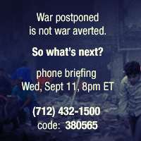 I’m heartened that my own U.S. Representative Rick Larsen e-mailed constituents asking for help in his decision about how to vote on the authorization of military force. I was happy to respond. And according to the latest FCNL Action Alert, as well as President Obama’s speech on Sept. 10, leaders are listening. It does appear that our country has moved, at least for now, a few steps back from military action and toward diplomacy as a response. Staff at FCNL are working hard to support this effort and remind us that “diplomacy is a marathon, not a sprint.” They’ve organized a conference call for tonight, Sept. 11, to talk about the most recent information from Capitol Hill and what the U.S.’s decision to back away from bombing Syria means for prospects for peace. To join the call set for 8 PM Eastern Time, dial (712) 432-1500 and then the access number 380565#.