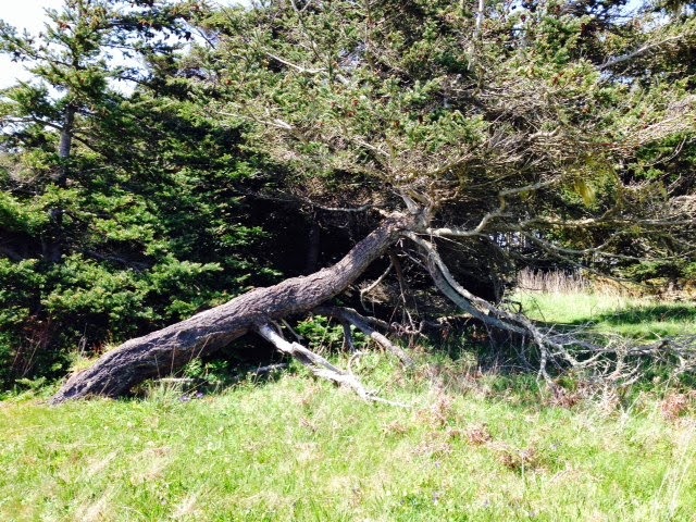 and sit among firs, their wind-twisted trunks bowed toward the ground.