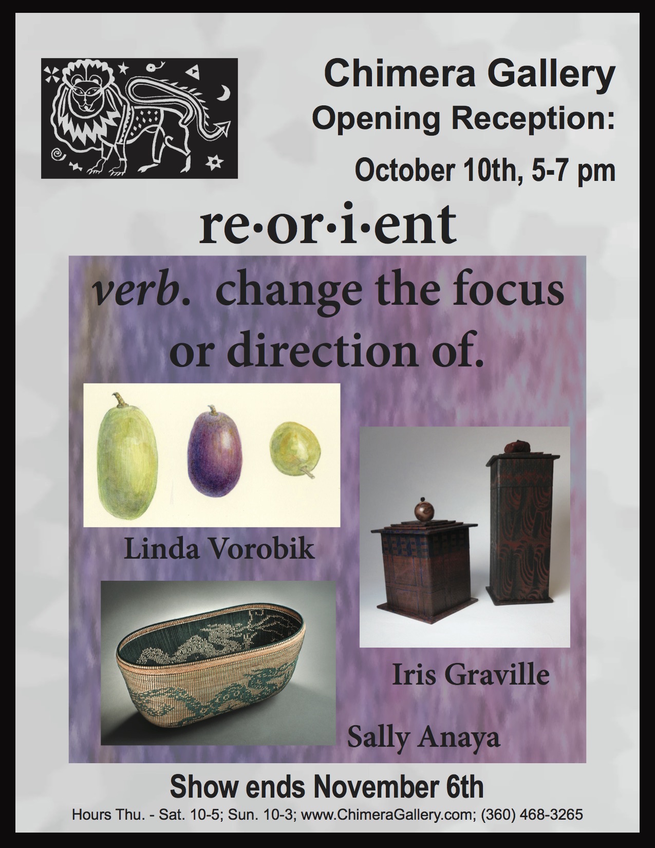 Another definition for reorient is: “to find one’s position again in relation to one’s surroundings.” Working with words and containers helps ground me to the people and places that surround me. Here are examples of the work by Sally and Linda that will surround mine. I look forward to reading their reflections on reorientation.
