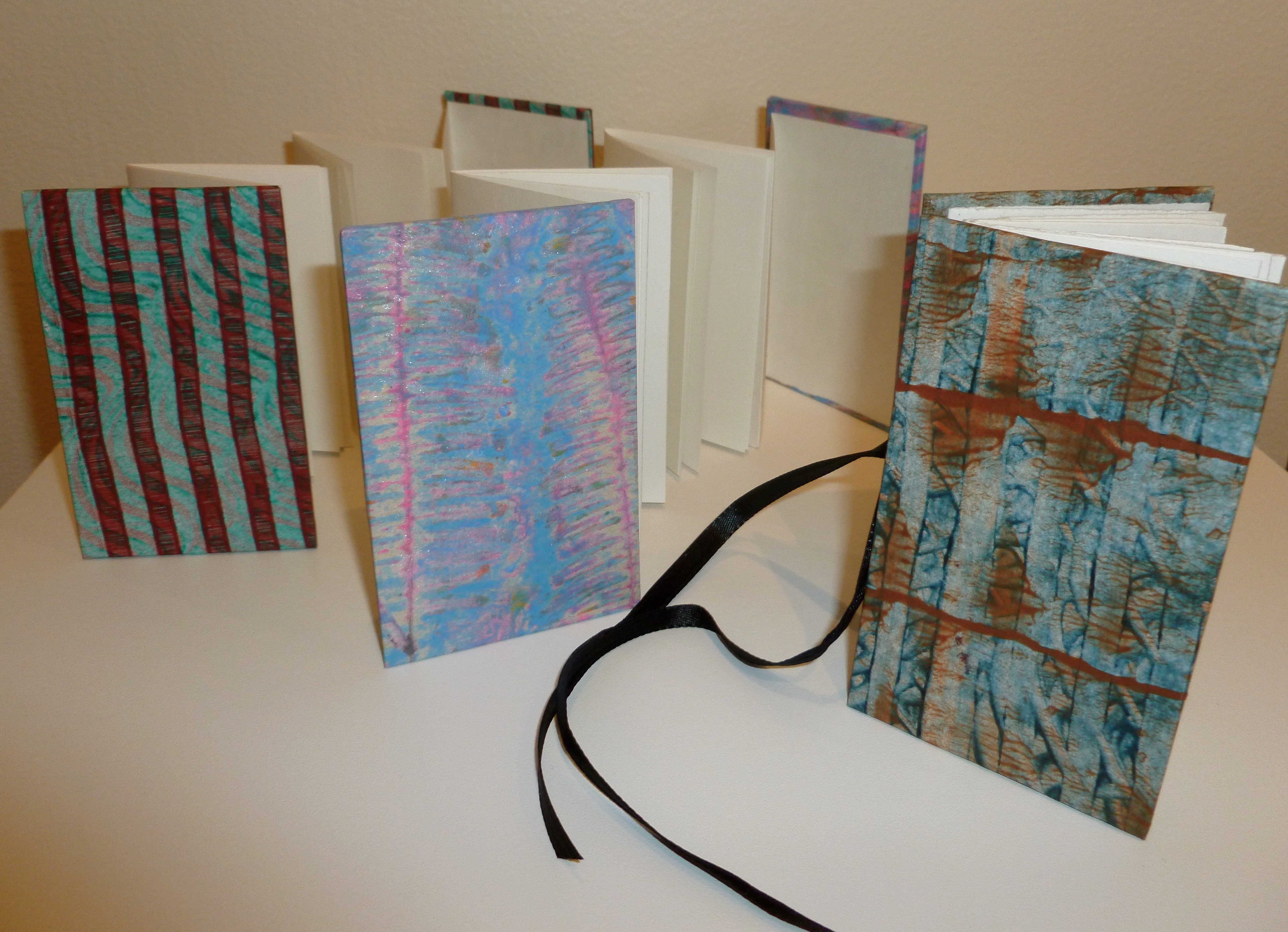 When I considered ways to “change the focus or direction of” my paper arts, I took the definition literally and figuratively. In this show, my hand-built boxes are more vertical than horizontal; some of my journals are square, instead of rectangular; and I’ve perched books in boxes that can be hung on the wall. Instead of painting on white paper to cover some of the books and boxes, I used black paper as the base and delighted in the ways the dark background changed the focus of the patterns. I also used hand-painted papers by Mabrie Ormes, an artist I met this summer at the Lithia Artisans Market in Ashland, OR.