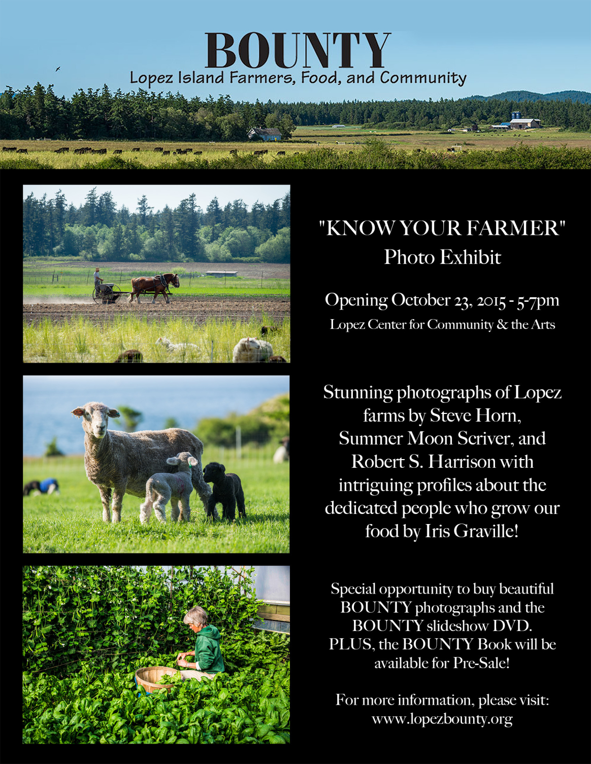 Phase II of BOUNTY is the “Know Your Farmer” exhibit. Sue, Steve, Summer Moon, and Robert chose from among hundreds of farm photographs for those that represent the diversity (and beauty) of farming on Lopez Island today. Lopez author Iris Graville wrote the profiles that accompany the farmers’ portraits; she developed those brief biographies from the farmers’ responses to the following questions: