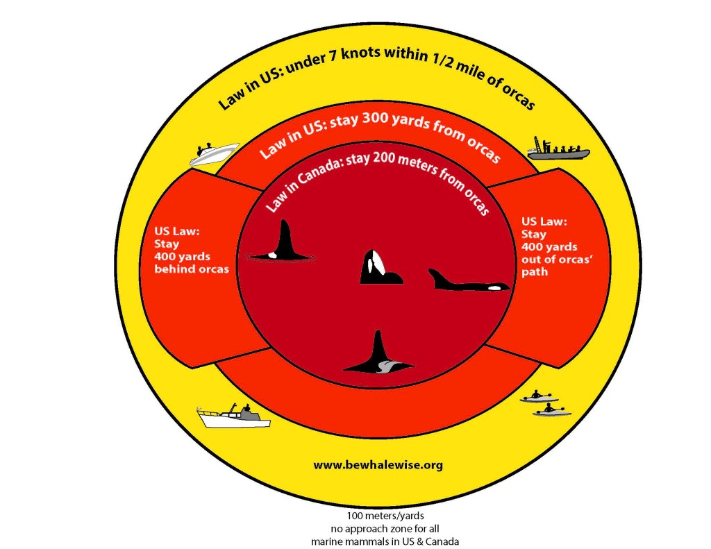 Vessel traffic can interrupt echolocation clicks the whales use to find fish. This is especially problematic for pregnant or nursing mothers. The National Oceanic and Atmospheric Administration (NOAA) Fisheries published research in January 2021 that indicated females often give up foraging when boats approach within four hundred yards. The Be Whale Wise campaign was started to help protect orcas from these disturbances.