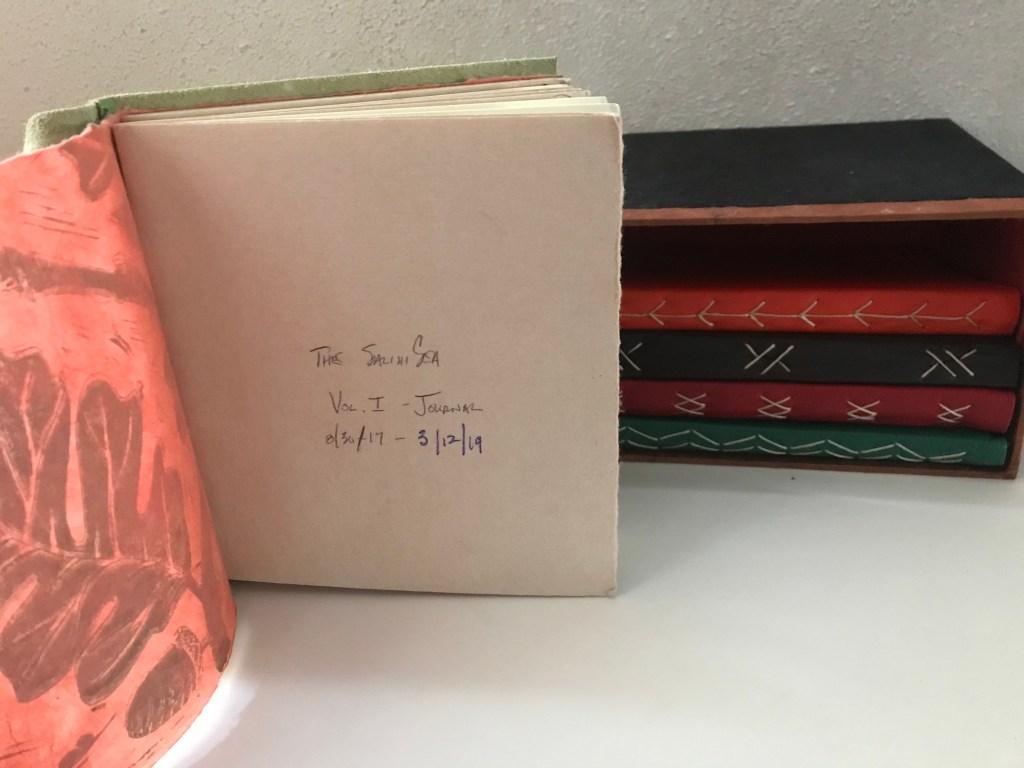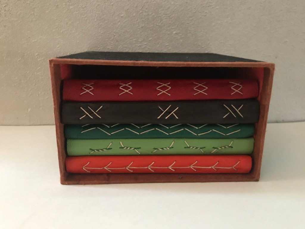 About the time I started to think about creating the Writer in Residence position on the Washington State Ferries, I went to a show by one of my favorite book artists, Brenna Jael of Slow Art Studio and Bindery. Iām a fan of Brennaās cards, hand-printed papers, upcycled books, and leather journals. Her heirloom journals are stunning, too. It was a Box of Blank Journals that captured my heart at her show. I knew Iād be working on essays while riding the Interisland ferry, and this handbound book set seemed ideal for handwritten notes.